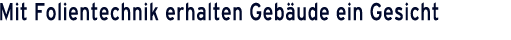 Im Bereich Corporate Building bieten sich fast unbegrenzte Möglichkeiten für das Medium Folie. Das Erscheinungsbild eines Unternehmens in der Öffentlichkeit – Corporate Identity – präsentiert sich über Corporate Design und Corporate Building. Innenraumkonzept und Gebäudegestaltung können mit Folien-Systemen individuell umgesetzt werden: Logo-Erstellung und Design- Beschilderung im Innen- und Außenbereich, Darstellung im Messebau, Ausführung von Farbkonzepten, Hitze- und Blendschutz in Unternehmensfarben.